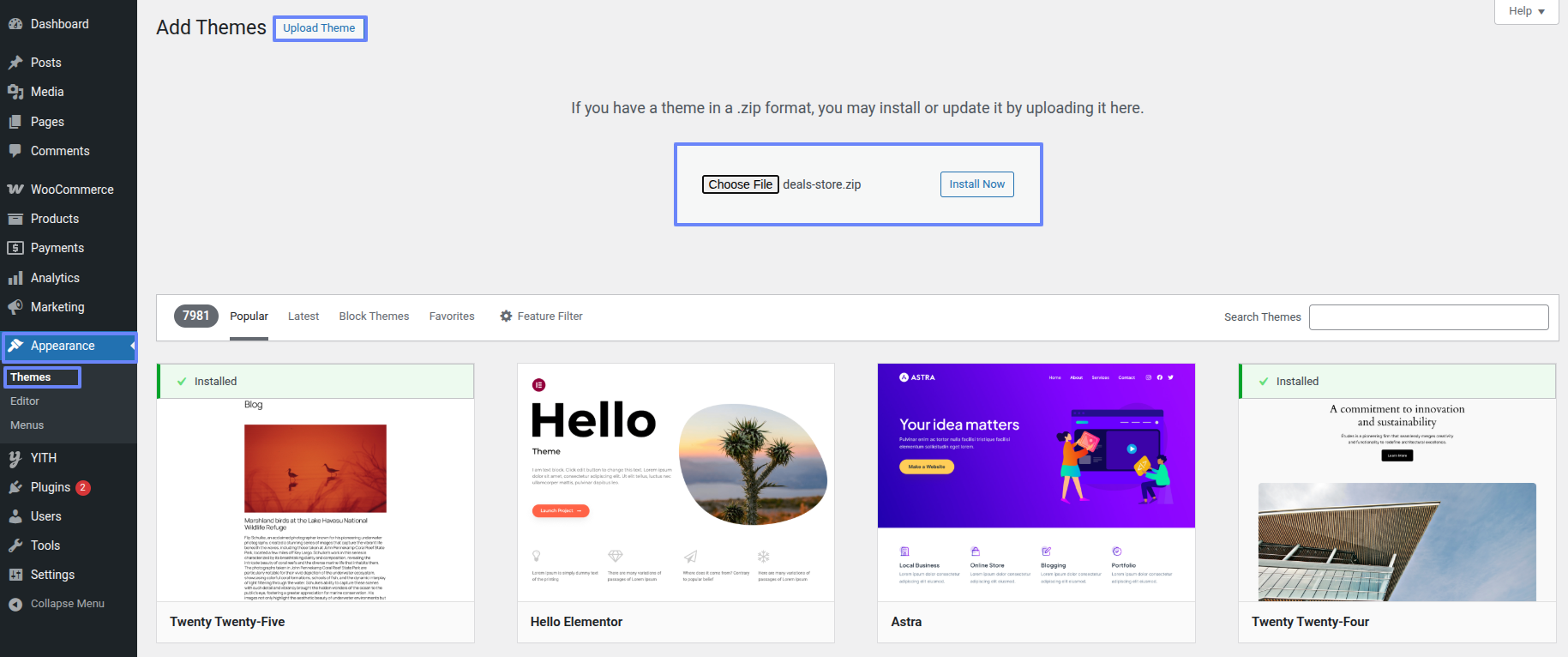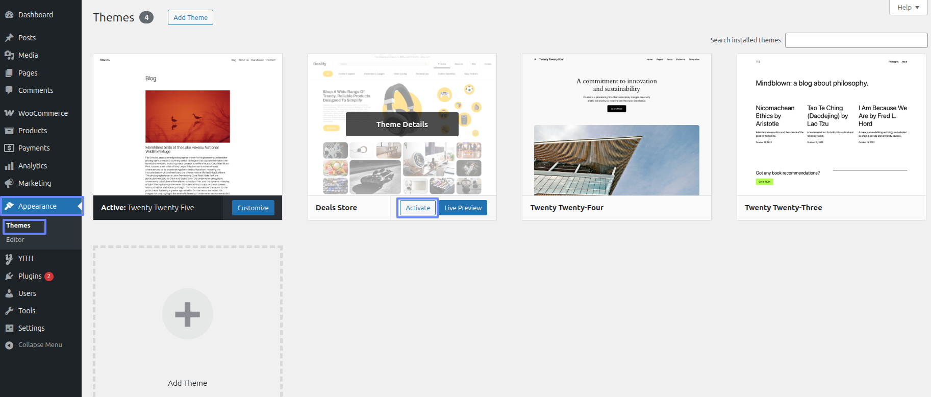 Eventually a theme has been transmitted, it must be activated.Activate the theme of a decision just entering Appearance ~~> Themes .