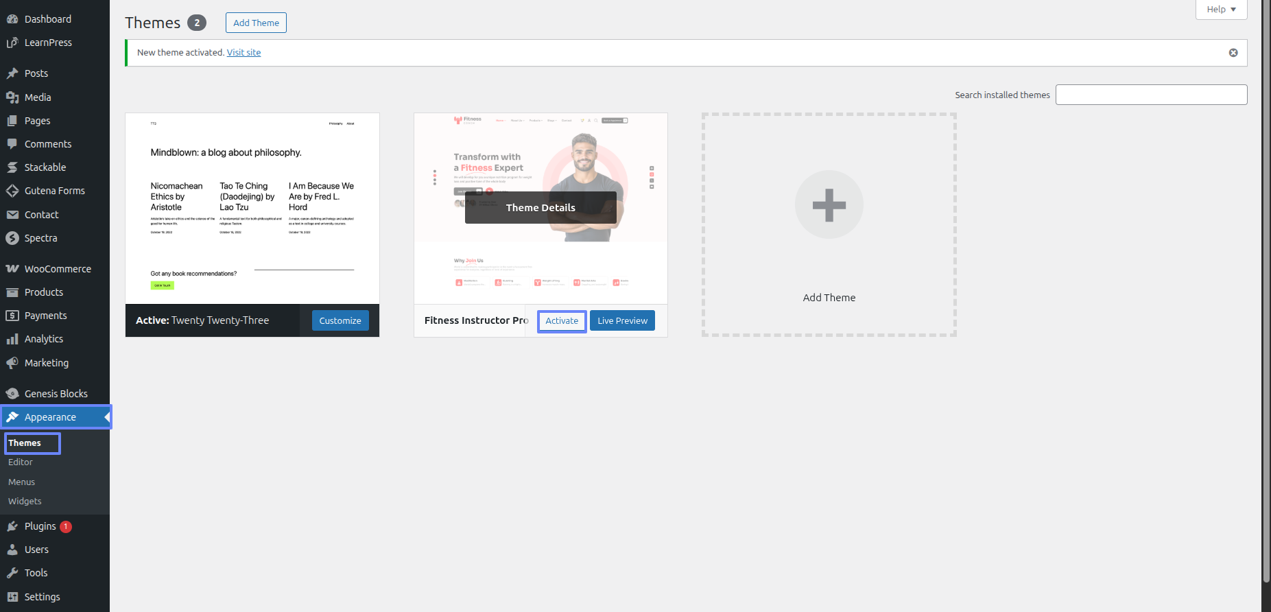 Eventually a theme has been transmitted, it must be activated.Activate the theme of a decision just entering Appearance ~~> Themes .