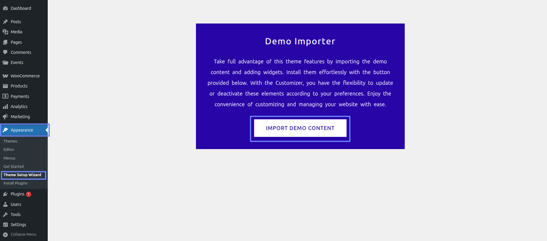 Continue perusing a Appearance ~~ Move forward to Theme Setup Wizard ~~ IMPORT DEMO CONTENT
