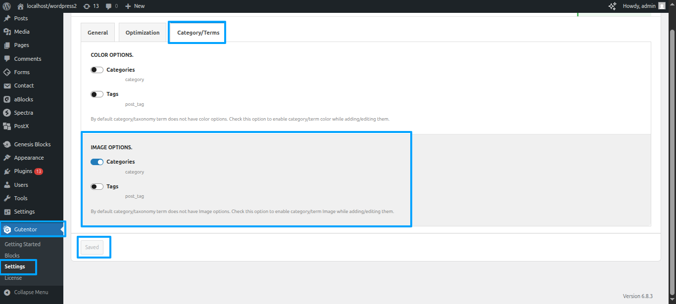 To add the images in the categories Dashboard ~~ Move forward to Gutentor Plugin ~~ Settings ~~ Category/Terms ~~ Image Options