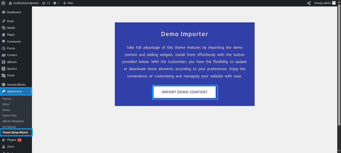 Continue perusing a Appearance ~~ Move forward to Theme Setup Wizard ~~ IMPORT DEMO CONTENT