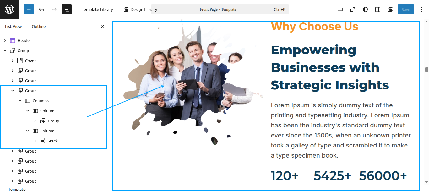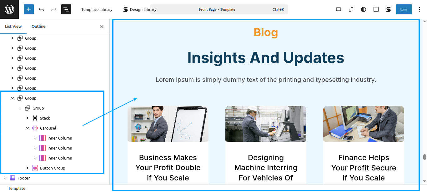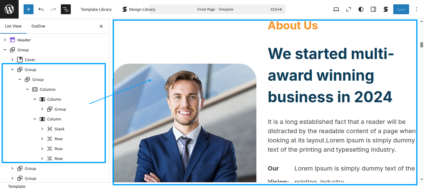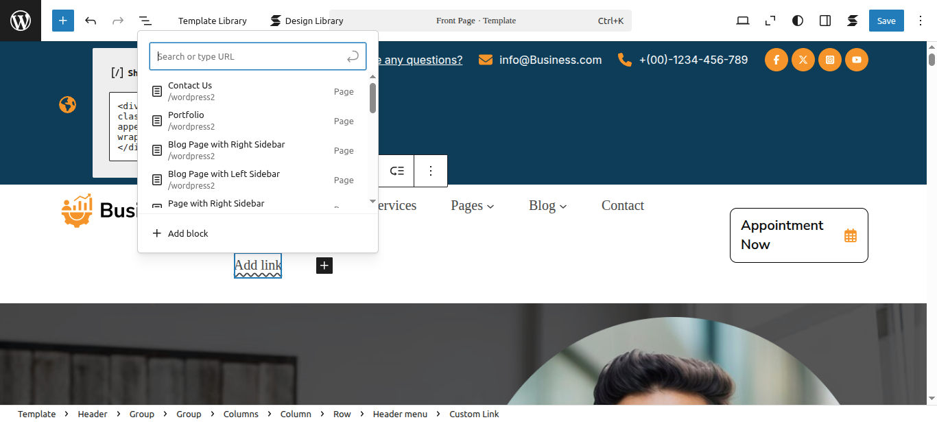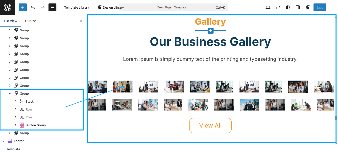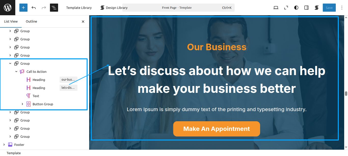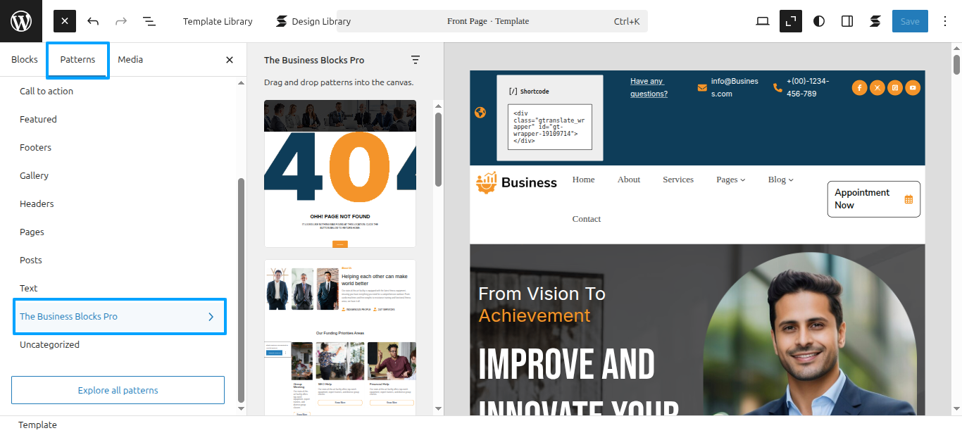 Tap "The Business Blocks Pro" during the list that appears when the side panel is appeared. Each theme is a pattern that may is able to implemented to each page.