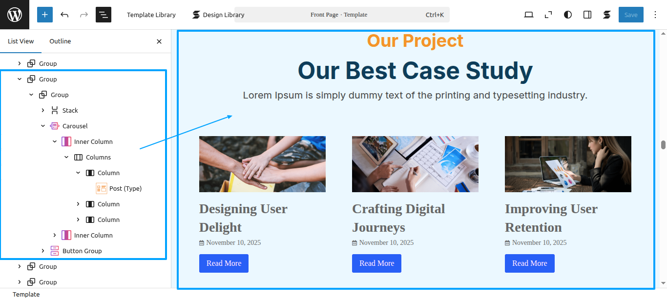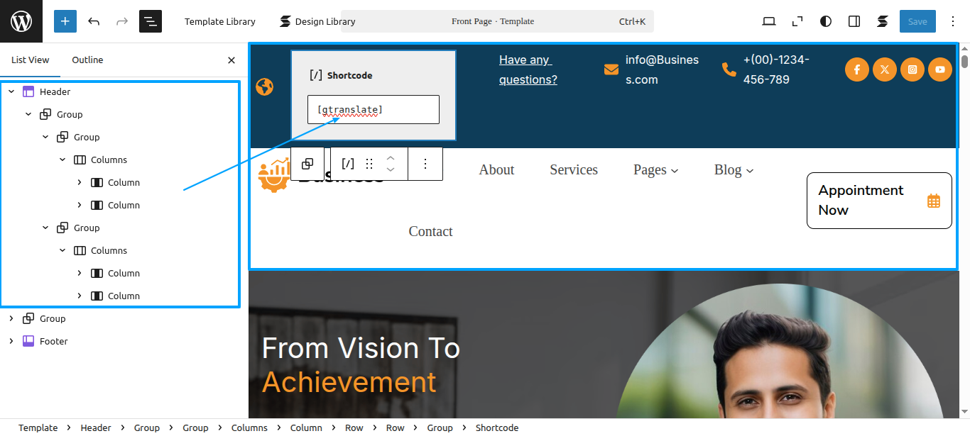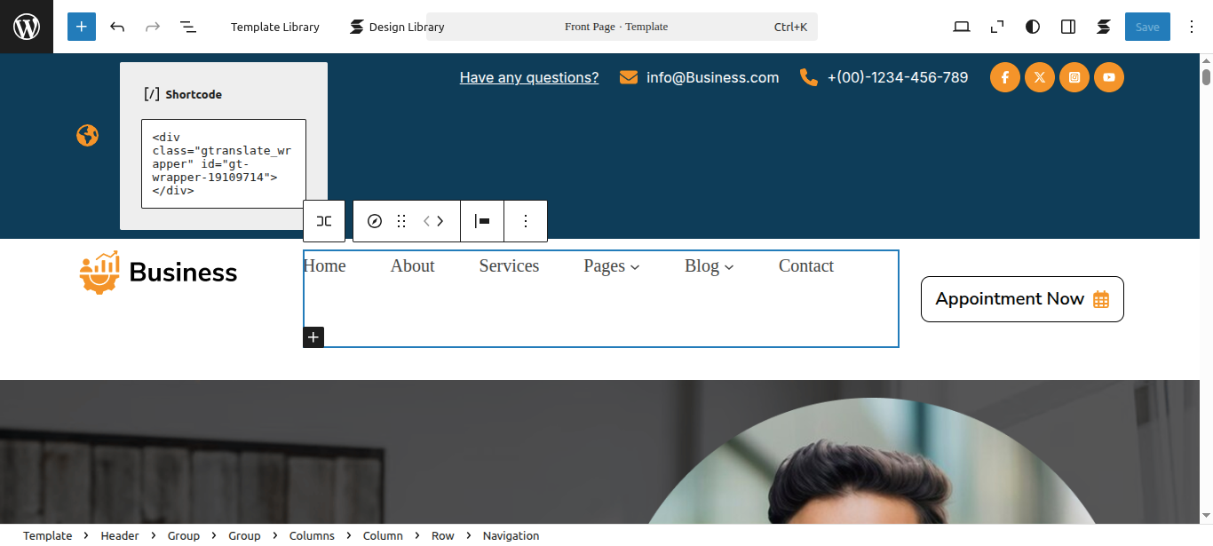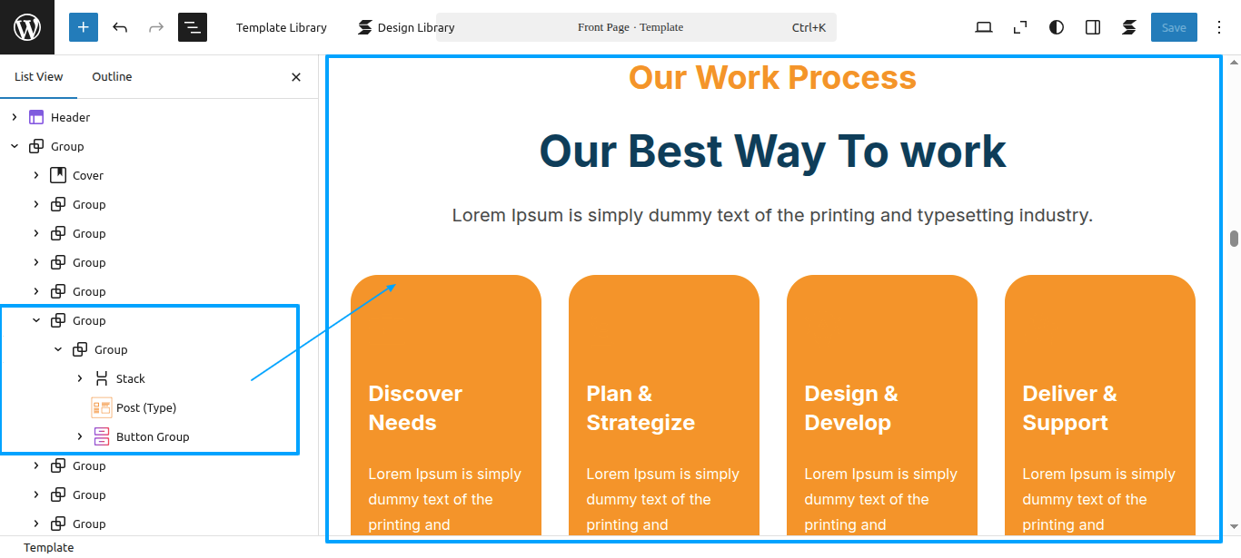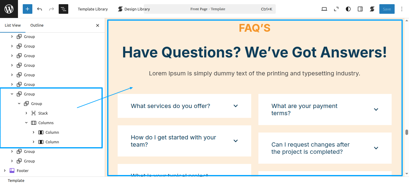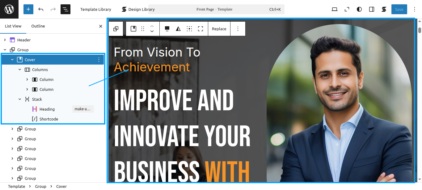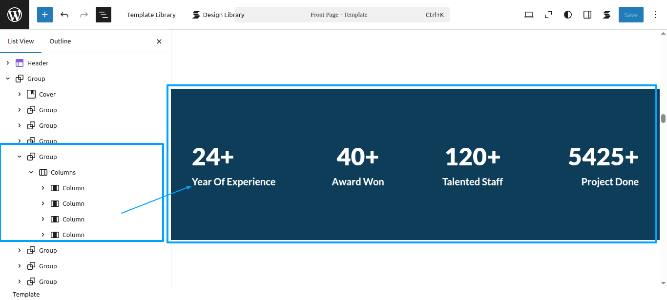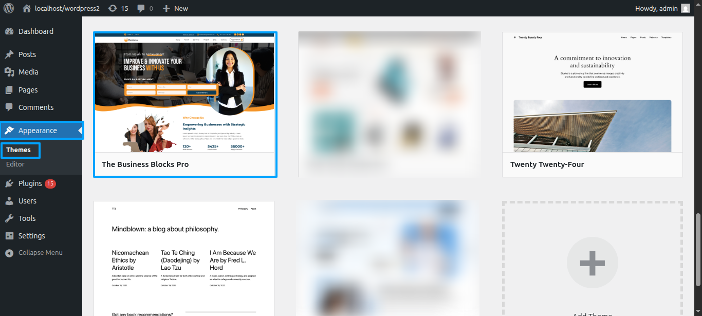 Tap "The Business Blocks Pro" during the list that appears when the side panel is appeared. Each theme is a pattern that may is able to implemented to each page.