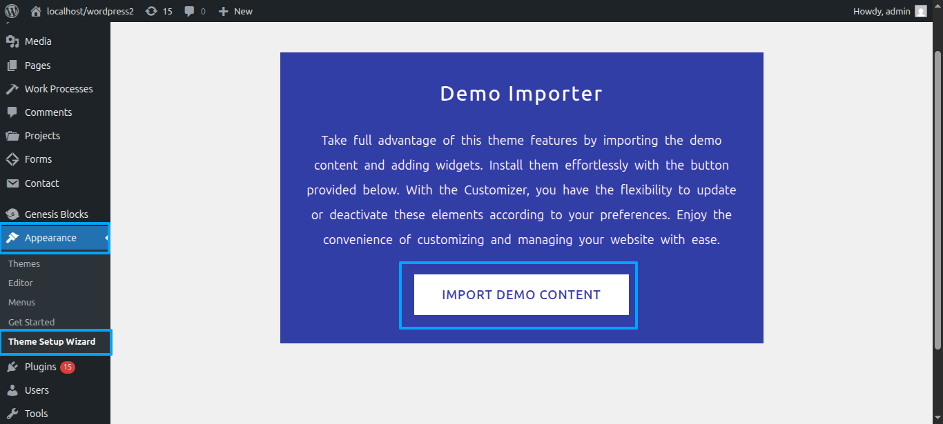 Continue perusing a Appearance ~~ Move forward to Theme Setup Wizard ~~ IMPORT DEMO CONTENT