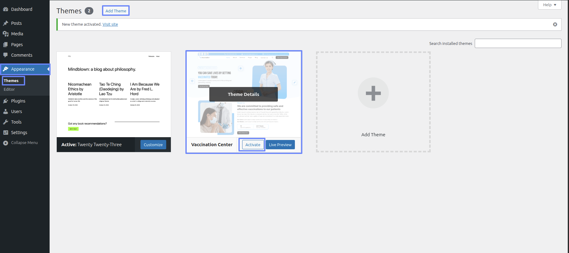 Eventually a theme has been transmitted, it must be activated.Activate the theme of a decision just entering Appearance ~~> Themes .