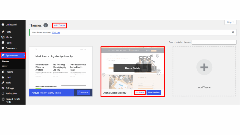 Themes can be browsed and activated directly from your WordPress dashboard under